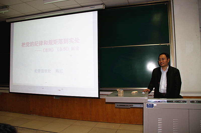 陈红副书记从背景、内容与落实三个方面详细解读了《中国共产党廉洁自律准则》与《中国共产党纪律处分条例》。报告中,他通过大量的腐败案例、违反中央八项规定精神问题统计数据,让大家深刻体会到了腐败的严重性与加强党员教育特别是干部党员教育的必要性。结合高校教师承担的学术、科研和育人工作的特殊性,陈红副书记带领大家重温了教育部高校教师红七条、七部门印发的《发表学术论文“五不准”》、《关于改进加强中央财政科研项目和资金管理的若干意见》(国发2014【11】号)等文件精神。