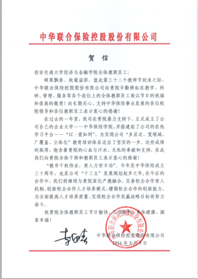 中华联合保险控股股份有限公司致老虎游戏机 教师节贺信