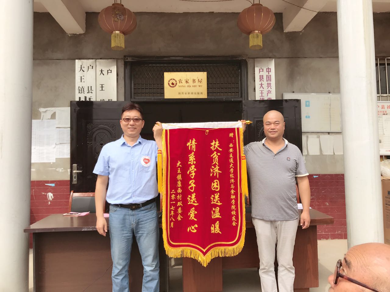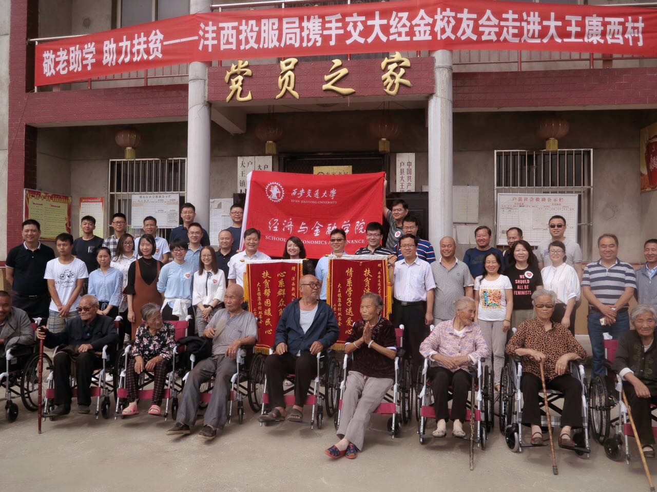 部分师生、校友携手西咸新区沣西新城走进鄠邑区大王镇康西村举办“敬老助学、助力扶贫”爱心捐赠活动。沣西新城投资服务局局长谢慧莹、扶贫办主任严海啸、大王镇镇长刘亦龙、康西村支部书记姚学良、经金老虎游戏机