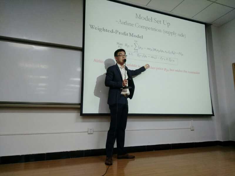 王焜博士首先对自己的研究方向做了说明,分别是交通经济政策、国际航空政策和航空和高铁的竞争等方面。接下来王焜博士针对中国市场进行政策限制下航空公司的竞争行为的研究报告,通过提出问题,做出相关假设,获取准确的数据,对航空公司的竞争机制进行计量经济学模型的设立与数据的分析,在模型设计中,提出了一种blp型的离散选择模型,明确考虑了政策限制对航空公司竞争行为的潜在影响,使得研究人员能够清楚不同航线的一系列竞争机制。最终得出三个结论:第一,中国乘客的需求与欧美乘客的需求相似。第二,由于受到民航总局限制,繁忙航线间是一种协作竞争。第三,运量低的航线趋于自由竞争。