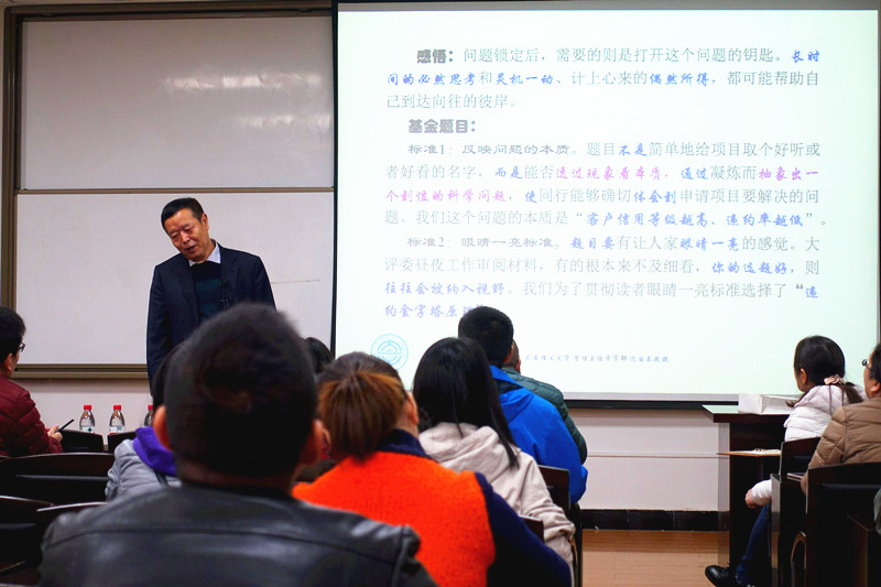 迟国泰教授基于自己申请和评价国家项目的经验为广大教师做了题为“关于申报国家纵向课题的体会与做法”的报告。报告共包括四部分内容:立项依据的撰写;项目的研究内容、研究目标以及拟解决的关键科学问题的撰写;拟采取的研究方案及可行性分析的描述;创新与特色的表述。首先,迟教授从选题要点、立项依据描述的要点以及选题的渠道或方法进行详细的讲解。迟教授认为选题一定要从发现一个好的科学问题开始,并引起评审人的共鸣。其次,迟教授对研究内容如何撰写,研究目标的撰写要点以及如何表述拟解决的关键问题进行交流。迟教授认为研究内容要焦点集中、通俗,避免目标和内容相混淆和相似。第三,迟教授就研究方法撰写、技术路线撰写以及可行性分析撰写进行报告交流。他认为研究方法不能太空洞、不具体,必须具体到某一个特定的具体方法上,技术路线无特色不行,要有新意、有创造。最后,迟教授从创新点的鉴别、何为创新点以及创新点表述中的几个常见问题等方面进行交流。迟教授认为创新应该是在具体点上的创新,不是在方面上的创新。应该解决哪一点的问题,而不是解决哪个方面上的问题。创新点要与研究内容相呼应。
