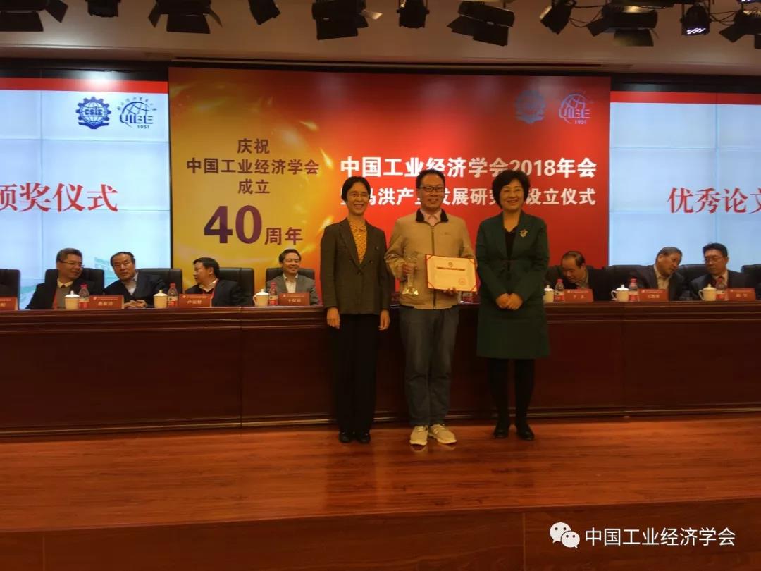 产业经济学专业博士生徐远华的论文《中国工业加速创新的新机制——基于人力资本分工与协同的研究视角》荣获唯一的一等奖。江小涓研究员和史丹研究员共同为徐远华博士颁发获奖证书和奖杯,并合影留念。
