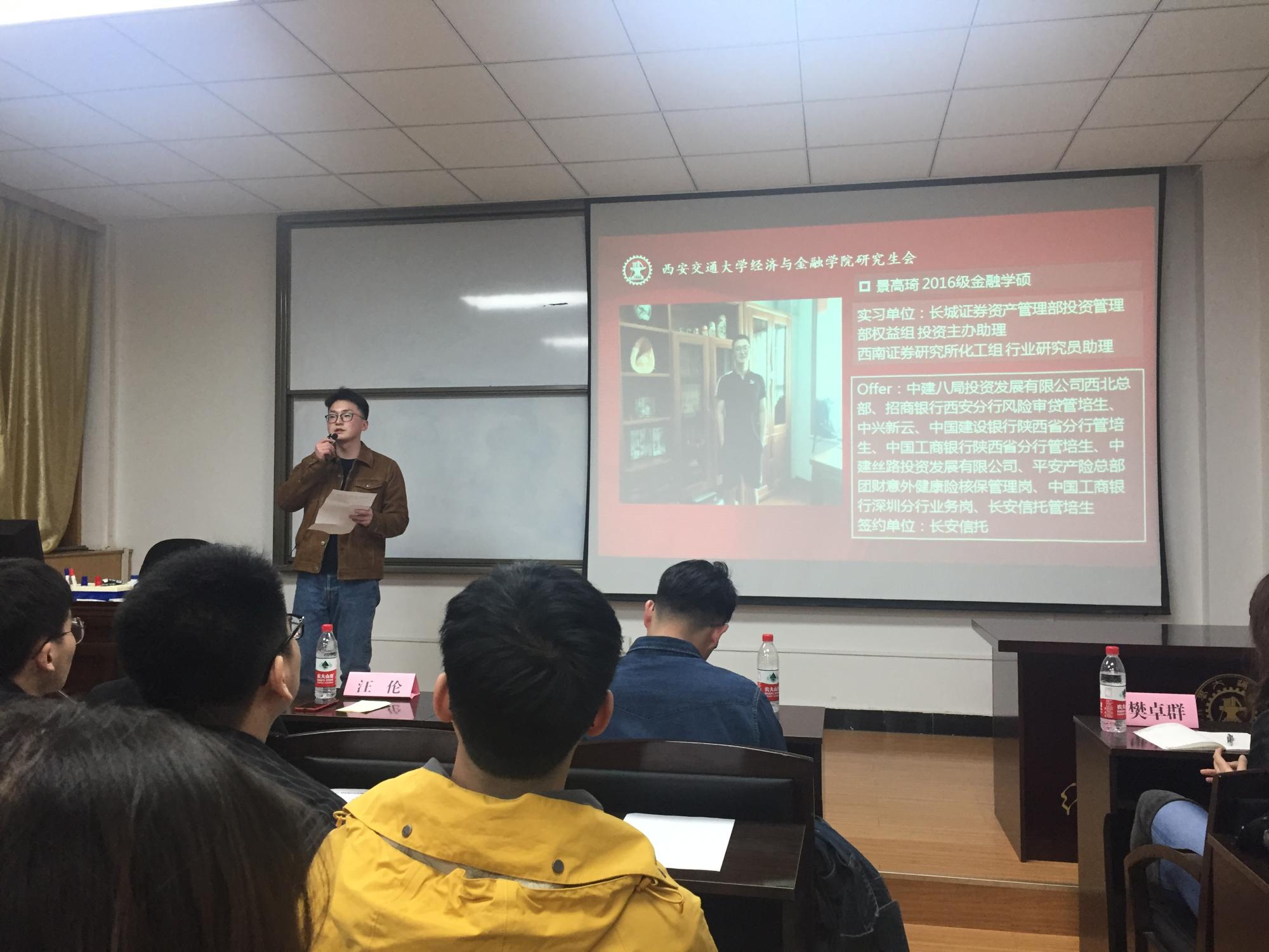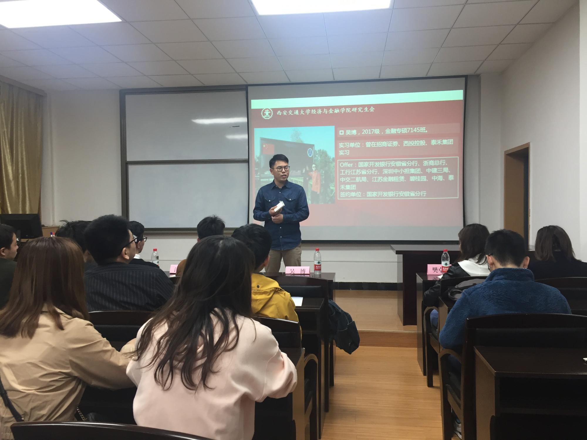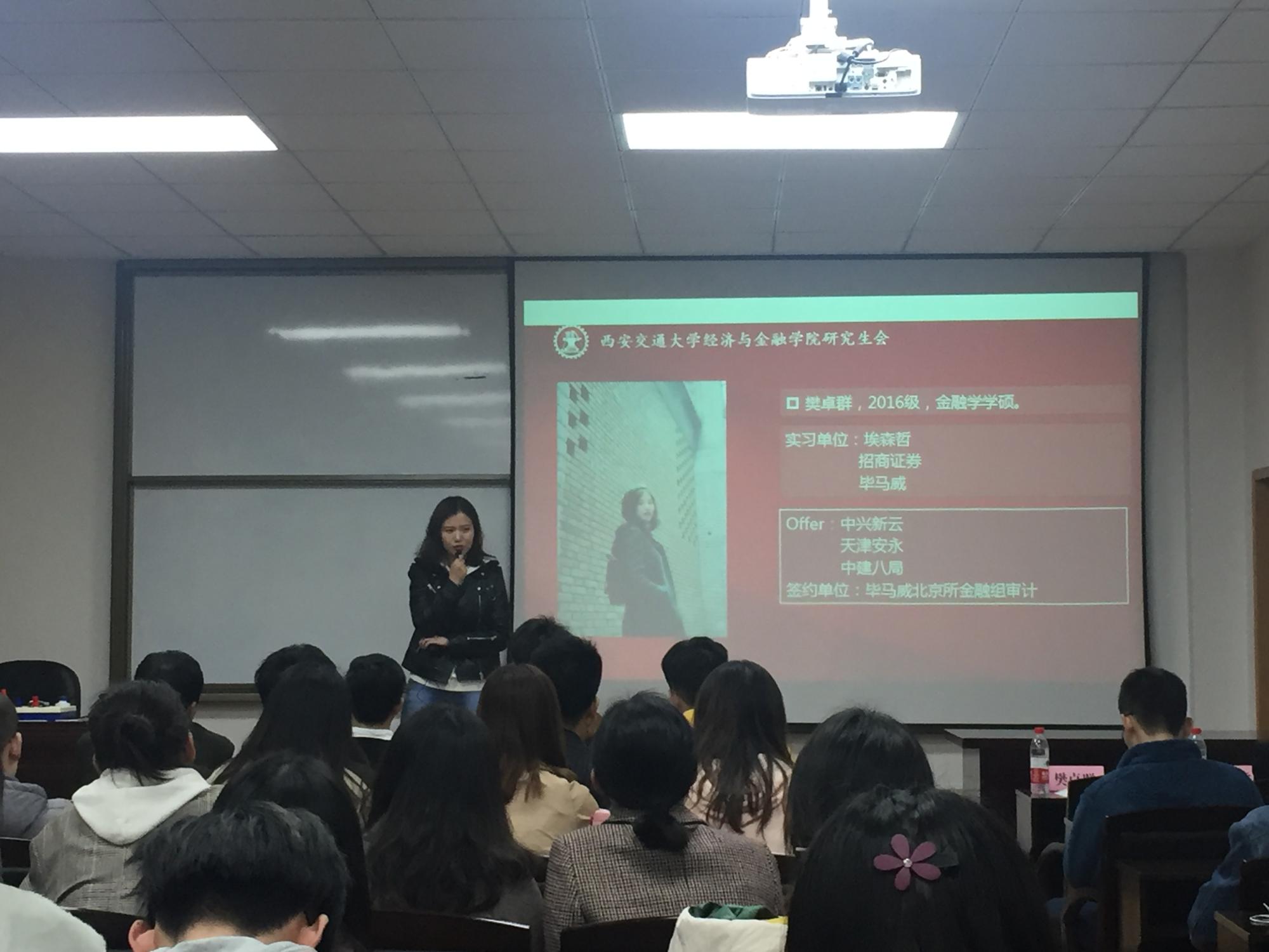 接下来进行分享的是2017级金融专硕的吴博同学。吴博成功拿到国开行安徽省分行、浙商总行、工行江苏省分行、深圳中小担集团、中建三局、中交二航局、江苏金融租赁、碧桂园、中海、泰禾等offer,曾于招商证券、西投控股、泰禾集团实习。他主要就自己秋招的经验进行了介绍,首先分别对各个银行笔试难度进行分析,然后从单面和群面两个角度进行经验总结,特别提出有些岗位面试对英语有较高的要求,最后吴博建议大家在秋招过程中做好心理准备,秋招是一段很难熬的经历,一定要及时进行心理调控。关于实习,他建议,大家要在实习中了解自己想要从事什么工作,并不断尝试。