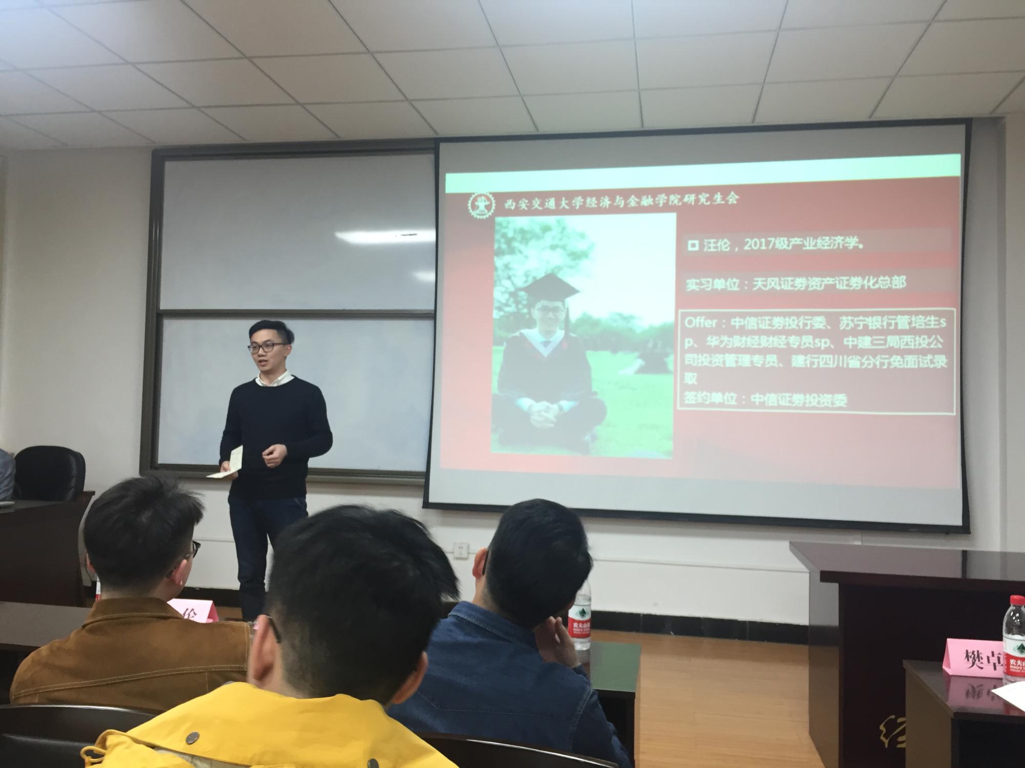 首先进行交流分享的是2017级产业经济学专业的汪伦同学。汪伦斩获了中信证券投行委,苏宁银行管培生(special offer),华为财经专员(special offer),中建三局西投公司投资管理专员,建行四川省分行免面试录取等offer,曾于天风证券资产证券化总部实习。他主要从券商和投行这两种职业选择进行介绍。关于券商,他建议,“牛市去小券商,熊市去大券商”,尽量避免选择排名较后的券商;对于投行,他认为,投行的优势在于工作光鲜,前期成长较快,后期转型空间比较大,但工作压力大。在实习方面,他不推荐行研类的远程小黑工,收获不大。最后汪伦同学就大小券商的选择问题及不同券商内部各种职业分配进行了介绍。