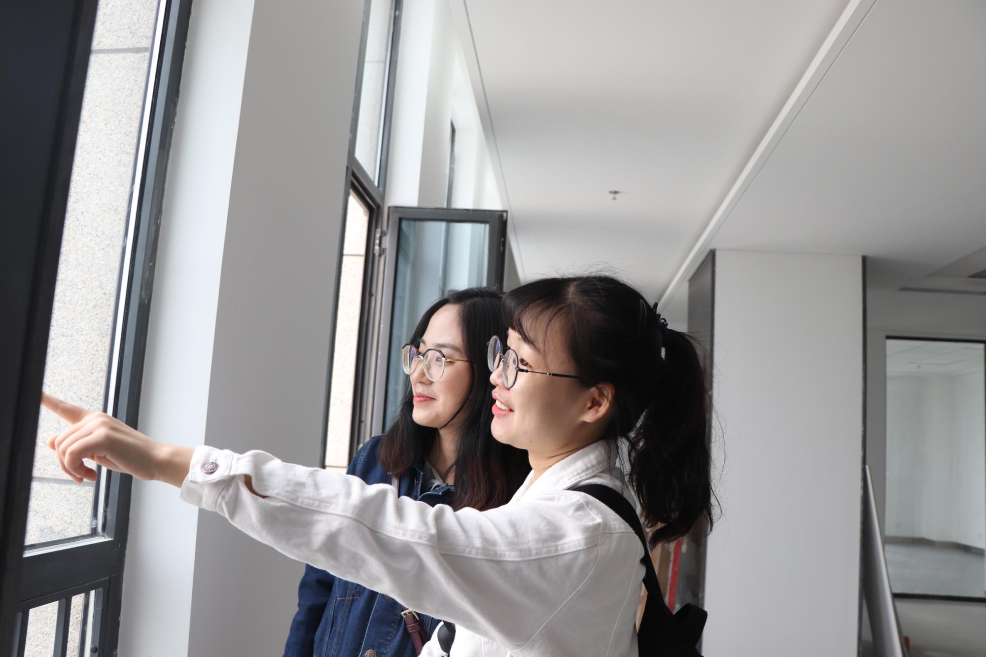 在创新港,主要参观的地点是文科大楼、学生公寓和食堂。文科大楼八楼是经济与金融研究院办公楼层,王老师为大家介绍办公区域大致布局,带领大家参观部分办工样板间,同学们深切感受是:创新港理念先进、规划长远,在这样一个广阔的平台一定大有所为。