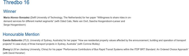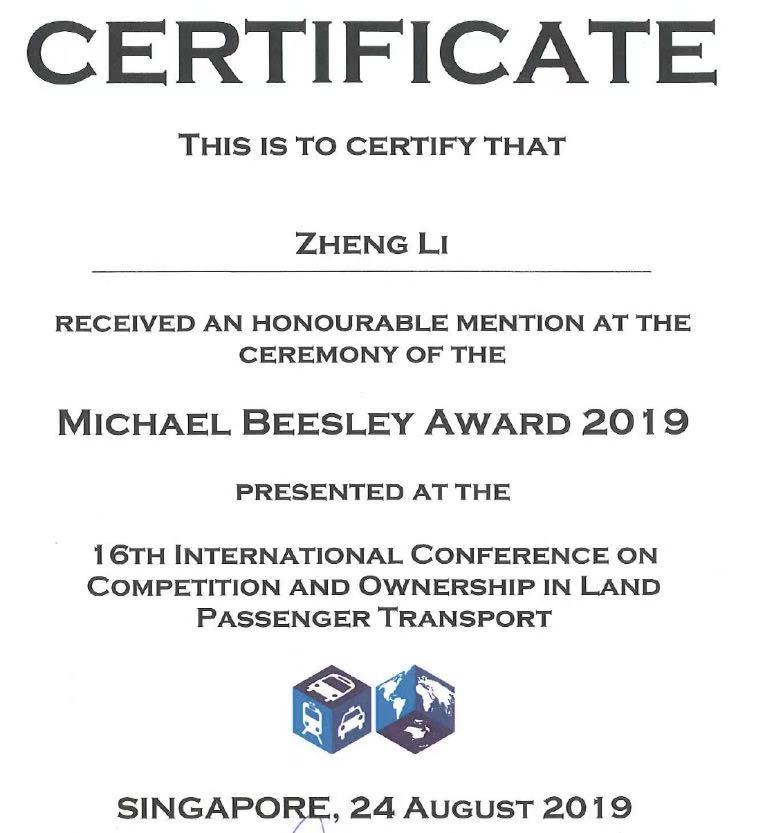 青年拔尖人才李铮教授是唯一来自中国大陆的与会者并受邀做了大会第一分会场的开场报告。Thredbo 16会议共录用论文145篇论文,李铮教授的论文:‘Performance Contributors of Bus Rapid Transit Systems within the ITDP BRT Standard: An Ordered Choice Approach’获得最佳论文奖(The Michael Beesley Award)的第二名(并列)。