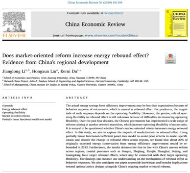 文章信息:Li, Jianglong; Liu, Hongxun; Du, Kerui. Does market-oriented reform increase energy rebound effect? Evidence from China's regional development. China Economic Review, 2019, DOI:10.1016/j.chieco.2019.101304.