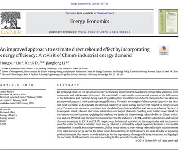 文章信息:Liu, Hongxun; Du, Kerui; Li, Jianglong. An improved approach to estimate direct rebound effect by incorporating energy efficiency: A revisit of China's industrial energy demand. Energy Economics, 2019, 80: 720-730.