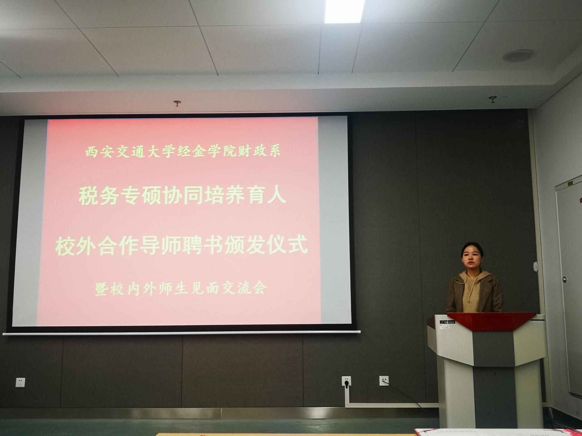 其次,四位校外合作导师从自身的工作经历和经验讲述了税务工作在国民经济、政府、企业、个人以及家庭中的地位作用和重要性;合理避税、纳税筹划不仅仅是企业的事情,个人和家庭也是必不可少十分重要的事情,尤其是随着市场经济的发展、大数据时代的到来,个人收入信息透明化,税务工作的范围不断扩大,专业税务人才需求急剧上升,税务人才大有可为。同时,四位合作导师一致表示,一定不辜负学校的期望,做好校企合作工作,最大限度的为我们的学生提供良好的社会实践条件,积极参与到税务专硕的教学和学生培养工作中,发挥实际工作者的优势,为学校培养优秀的专业人才贡献力量。四位校外合作导师的讲述使我们对税务工作有了一个新的更加深刻的认识。第三,2019级税务专硕班长赵文秀代表学生发言,她表示通过今天的活动使我们同学对税务专业有了进一步的认识,也更加喜欢这个专业,虽然目前我们还没有一个具体的研究方向,但是我们一定不辜负老师们的期望,在努力学好专业知识的同时,去发现和寻找自己喜欢和感兴趣的方向与问题,进行深入的研究。第四,由我院党委书记宋丽颖教授为四位校外合作导师颁发了聘书。