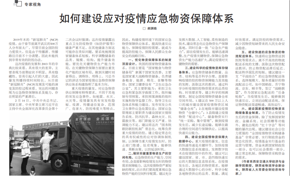 教授,陕西省物流学会副会长,陕西省人大常委会财经咨询专家郝渊晓2月24日在《现代物流报》的发表《如何建设应对疫情应急物资保障体系》一文中指出:重大疫情的暴发,对应急物资供应保障有特殊要求,如地震、水灾、火灾等疫情暴发具有突发性隐秘、疫源、传播途径复杂、范围广、 危害大、防控难度大等特点,因此,构建疫情环境下的国家应急物资保障供应体系,提高快速反应能力,保障疫情防控需要,就成为提高防控能力,保障人民群众生命安全的战略目标。
