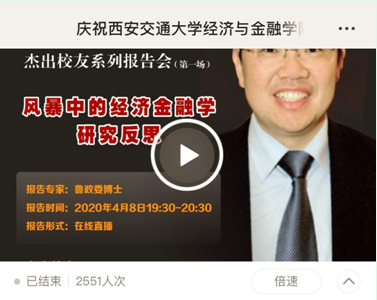 建院二十周年暨西安交通大学财经教育成立九十周年杰出校友系列线上活动的首场报告会,取得了广泛热烈的社会影响,吸引了2300余人同步在线观看。