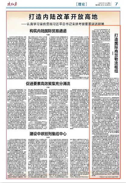 习近平总书记来陕考察时指出,要深度融入共建“一带一路”大格局,加快形成面向中亚南亚西亚国家的通道、商贸物流枢纽、重要产业和人文交流基地,构筑内陆地区效率高、成本低、服务优的国际贸易通道。这对于陕西“打造内陆改革开放高地”,实现新时代追赶超越具有重要战略意义。陕西应抢抓机遇、真抓实干,加大建设步伐,把习近平总书记重要讲话精神落到实处。