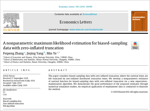 青年拔尖人才张飞鹏教授作为第一署名作者在国际高水平期刊《EconomicsLetters》的2020年第194卷上发表了题为“A nonparametric maximum likelihood estimation for biased-sampling data with zero-inflated truncation”的学术论文。