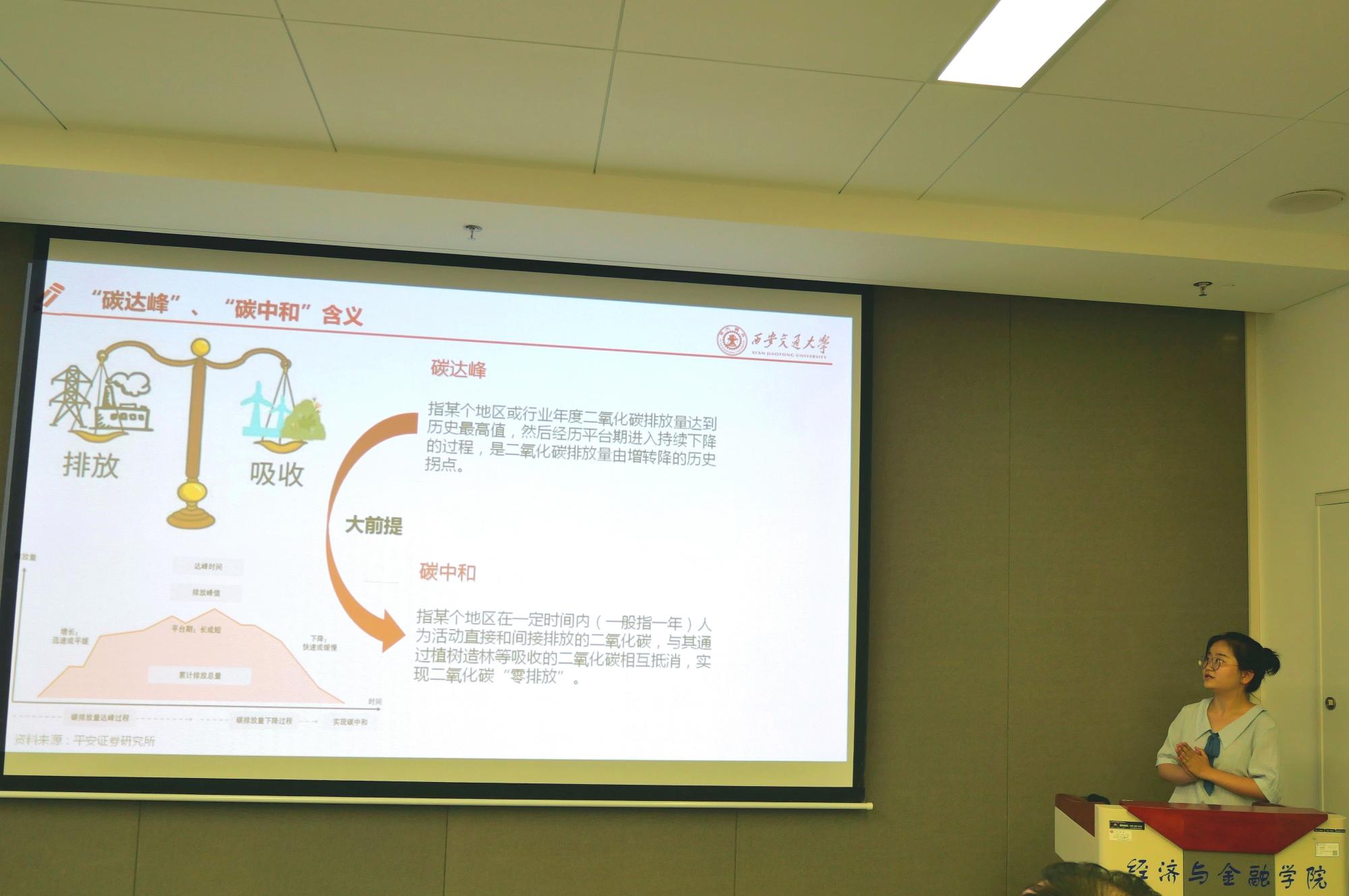 “经策”宣讲团成员罗如君博士,向大家做了“四史”学习宣讲。她从经济学角度出发,以《双碳目标——中国的承诺》为主题,从中国共产党领导下“双碳目标”的概念界定、提出“碳达峰”的原因与“碳中和”的实现路径三个方面展开宣讲,展示了“十三五”期间为应对气候变化,党的工作取得的显著成效,呼吁大家明大德、守公德、严私德,积极履行个体“碳责”。