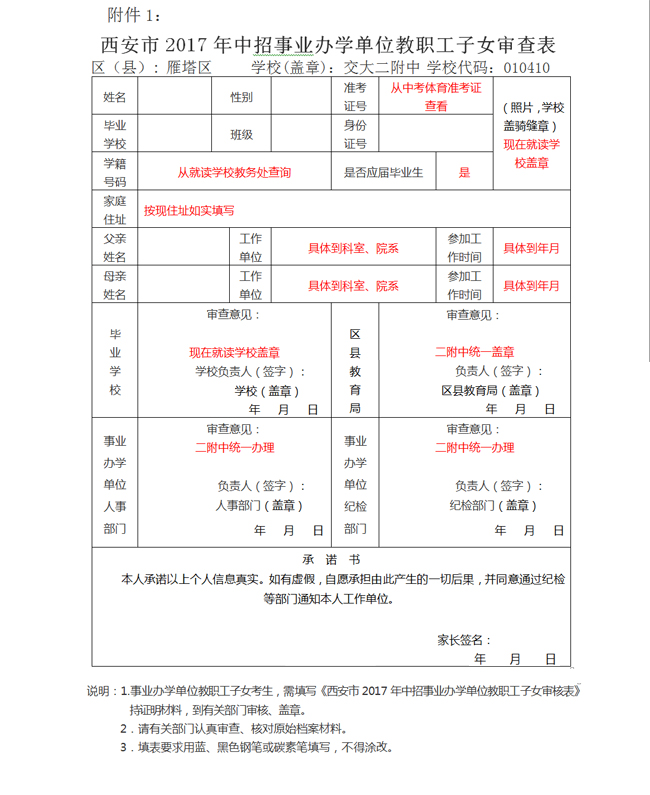 未在二附中就读的学生的《西安市2017年中招事业办学单位教职工子女审查表》填写三份,每份审查表的“照片的骑缝章” “毕业学校审查意见”均由毕业学校审查并盖章;区县教育局审查意见、事业单位人事部门和纪检部门由二附中统一办理。