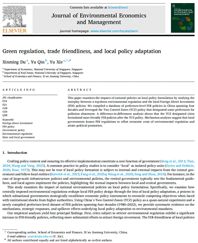 谢煜助理教授(通讯作者)与新加坡国立大学秦雨教授、新加坡国立大学杜馨铭助理教授合作的论文“Green Regulation, Trade Friendliness, and Local Policy Adaptation”在环境经济学领域的顶级学术期刊Journal of Environmental Economics and Management正式发表。谢煜助理教授为本文共同第一作者兼通讯作者。